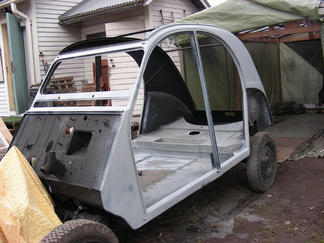 No, kun putki kerran oli päällä, vetäisin koko korin ulkopuolen ruosteenestopohjamaalilla ja kun maalia riitti niin suttasin myös sisäpuolen lattioita lukuun ottamatta. Viimeisiä roiskeita viskellessä rupesi satamaan, mutta kerettiin Rouvan kanssa pukata Eldo piiloon ja pahemmilta vaurioilta vältyttiin.