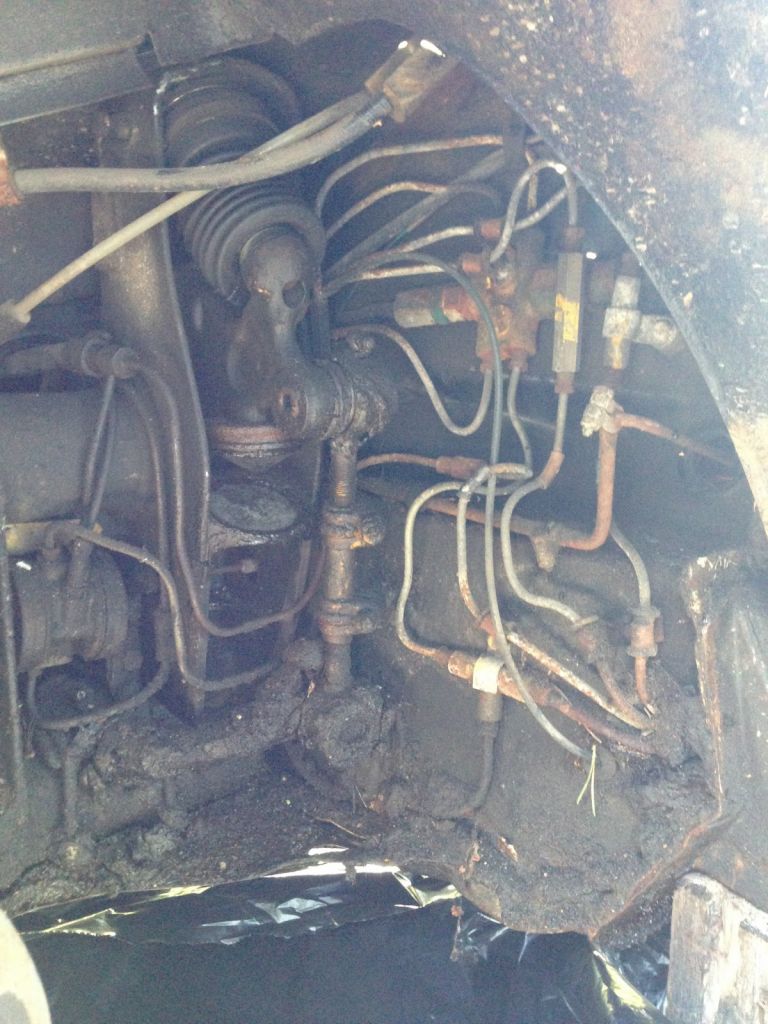 Saman tutkiskelun yhteydessä selvisi mistä sitä Vihreätä oikein keulan alle ilmestyy. Ohjaustehostin valutteli melko suorana rattia pyöritellessä, samoin apumiehenpuolen haitariputki oli märkä. Jarrutehostin (vai onkos se muuten pääsylinteri???) vuosi myös, jokaisen polkaisun jälkeen rintapellin läpi tuleva venttiili tiputteli n. 3 tippaa LHM:ää. Kuskin jalkatilassa olevan kotelon pohjalla oli 5mm litkua ja joka polkaisulla sitä hiukkasen lisää sinne lirahti. Varaosien puutteen vuoksi em. seikoille ei voitu mitään, mutta TODO –lista kasvoi taas muutamalla rivillä.