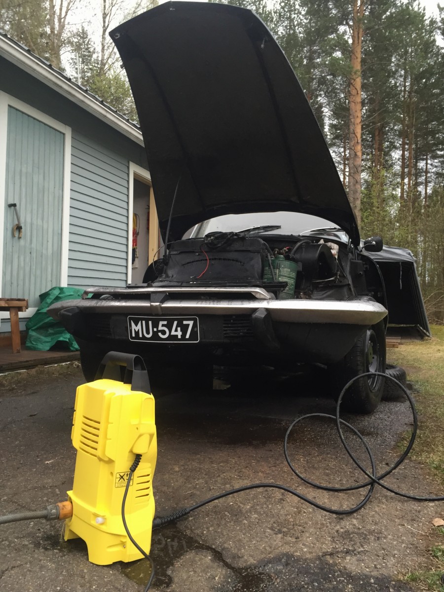 Jonkun pitkän tangon, oliskos ollu vaihdevipu ja pari korkeapaineputkea ja yhen plöröpuolen putken irrotettuani tilaa alkoikin olla varsinaisten kiinnityspulttien irrotteluun ja pian (3h kuluttua) liukas vihreä mollukka oli irti. Oli näköjään mallia halpis eli huoltovapaa eli ongelmajätettä versio.