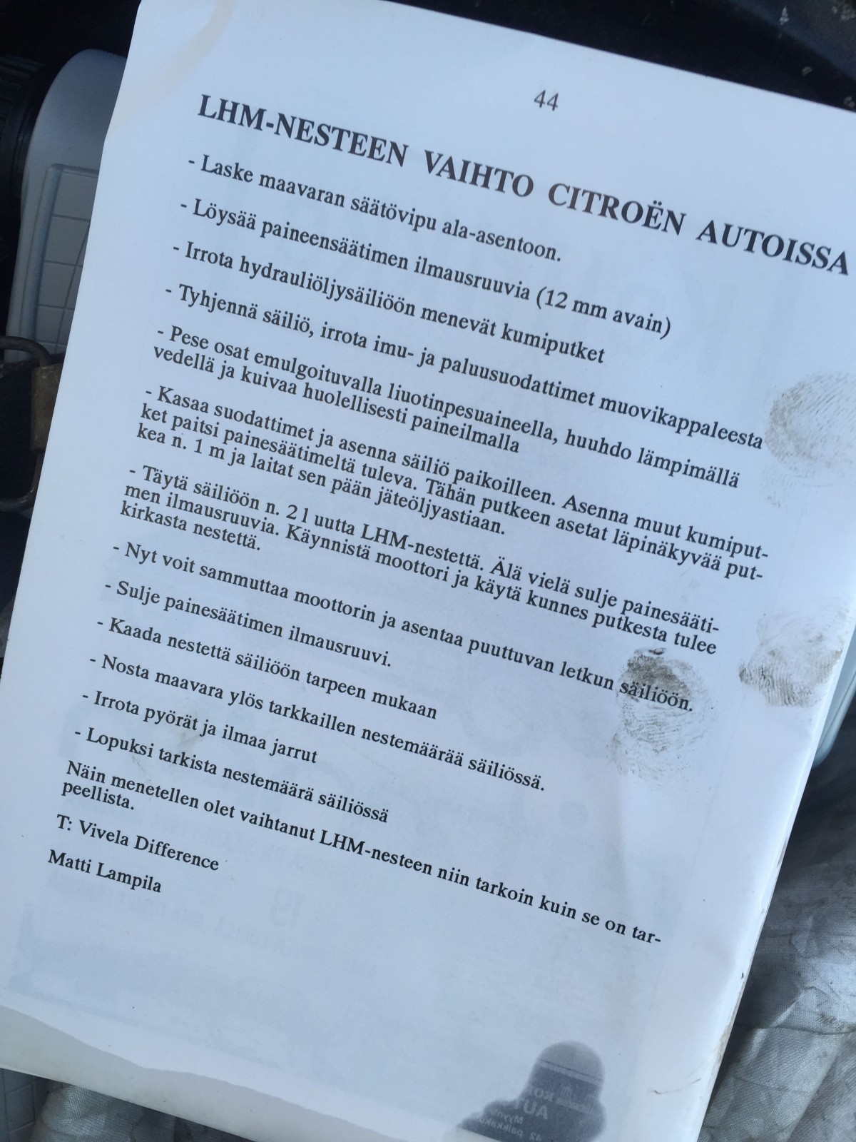 Suureksi Iloksi ja riemuksi löysin Sitikkapuoskarin joskus 90 -luvulla Citikka (?) -lehteen kirjoittaman jutun nesteiden vaihdosta Citroeniin ja sitä soveltamalla (eli en purkanut LHM -säiliötä veks) homma onnistui yllättävän pienellä kaaoksella. Tai no, yritin kyllä ottaa videota siitä kun LHM -säiliöstä pumpataan litkuja jäteöljyastiaan, mutta jossain vaiheessa projektia pumpun poistoputki pomppasi pois säililöstä ja roiskutti LHM:t ympäri konehuonetta, keulaa ja päin näköä jolloin videosta tuli niin väkivaltainen ja karkeaa kielenkäyttöä sisältävä, että päätin jättää sen julkaisematta.