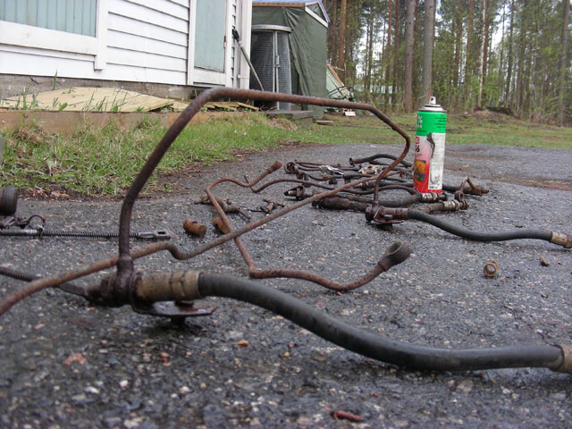 Inventaariota : hyviä wanhoja putkia löytyy mistä valkata, kaikki jarrusylinterit on uudet, pääsylinterissä uudet sisuskalut, samoin kupariset tiivisterenkahat ja ylen uudet notgiat gummiputketkin löytyi. Osa putkien liitospulteistakin löytyi uusia, vaan sylinterien päihin joutunee laitteleen käytettyjä pultteja. Etukenkien asennussarjakin löytyi jemmasta, mahtavata. Puuttuu kuitenkin 3 kpl kenkien alapäiden epäkeskomuttereita... Pärkele, mulla on jossain ziljoona niitä vaan en löytäny vaikka kuinka kolasin. Viimeks näin purnukan kun rakensin taka-akselistoa ja sen jälkeen oon jemmannu sen jonnekin järkevään paikkaan 🙁