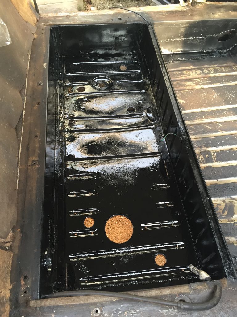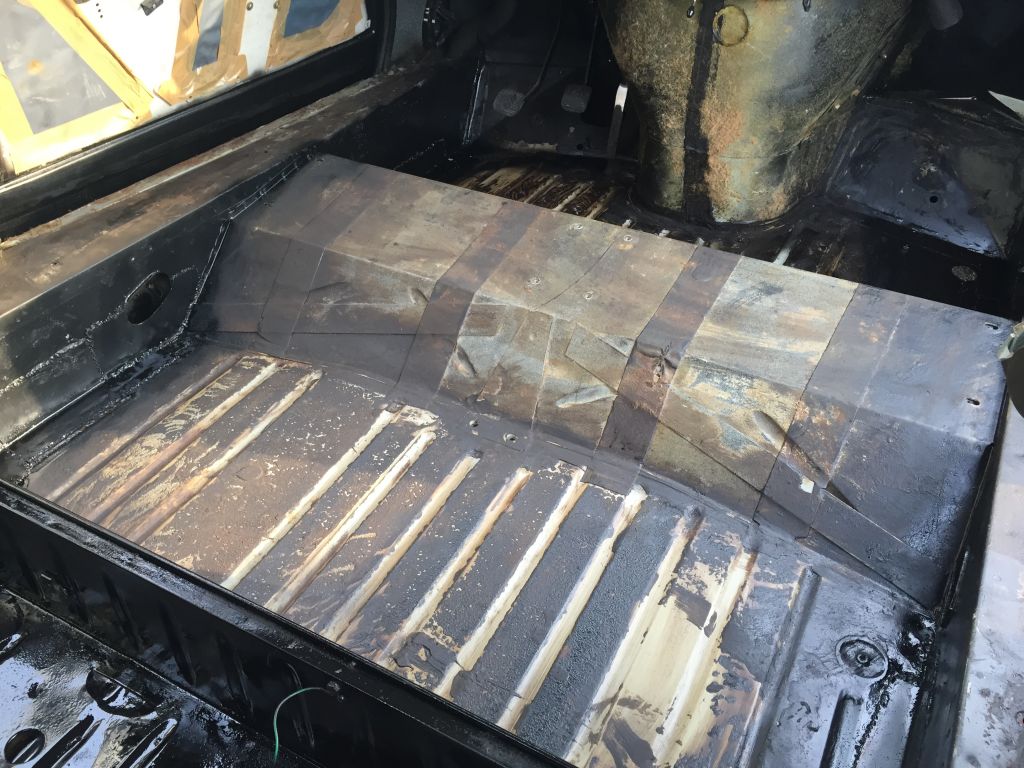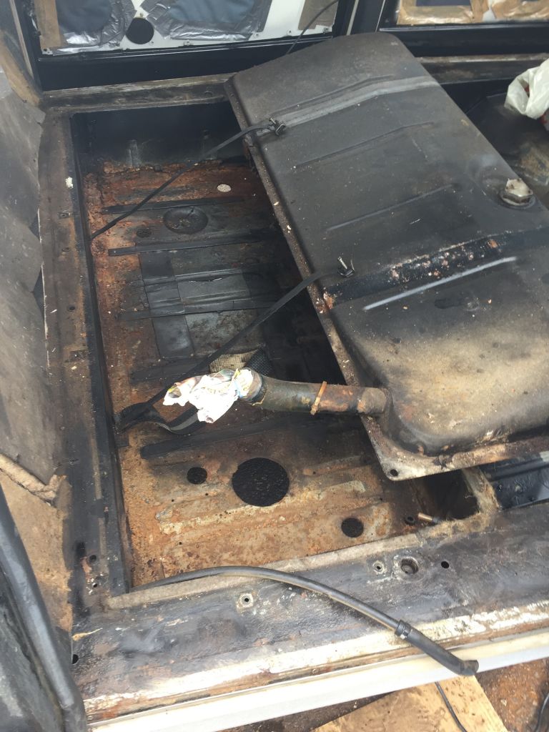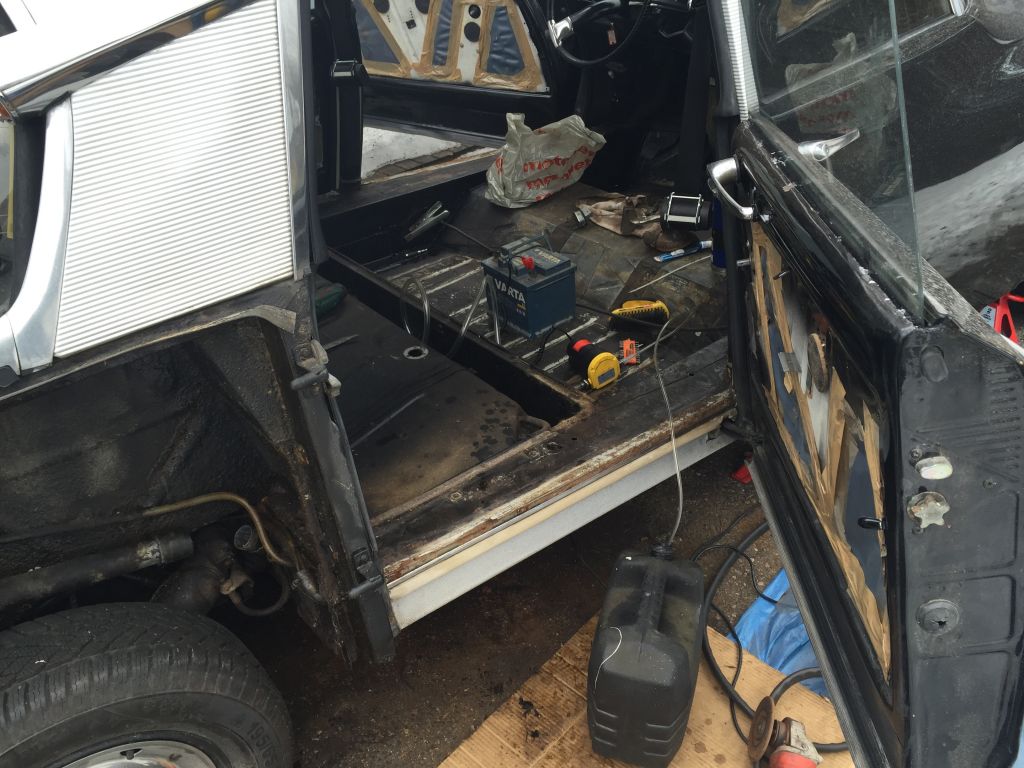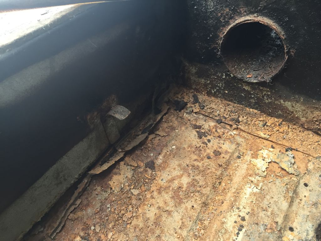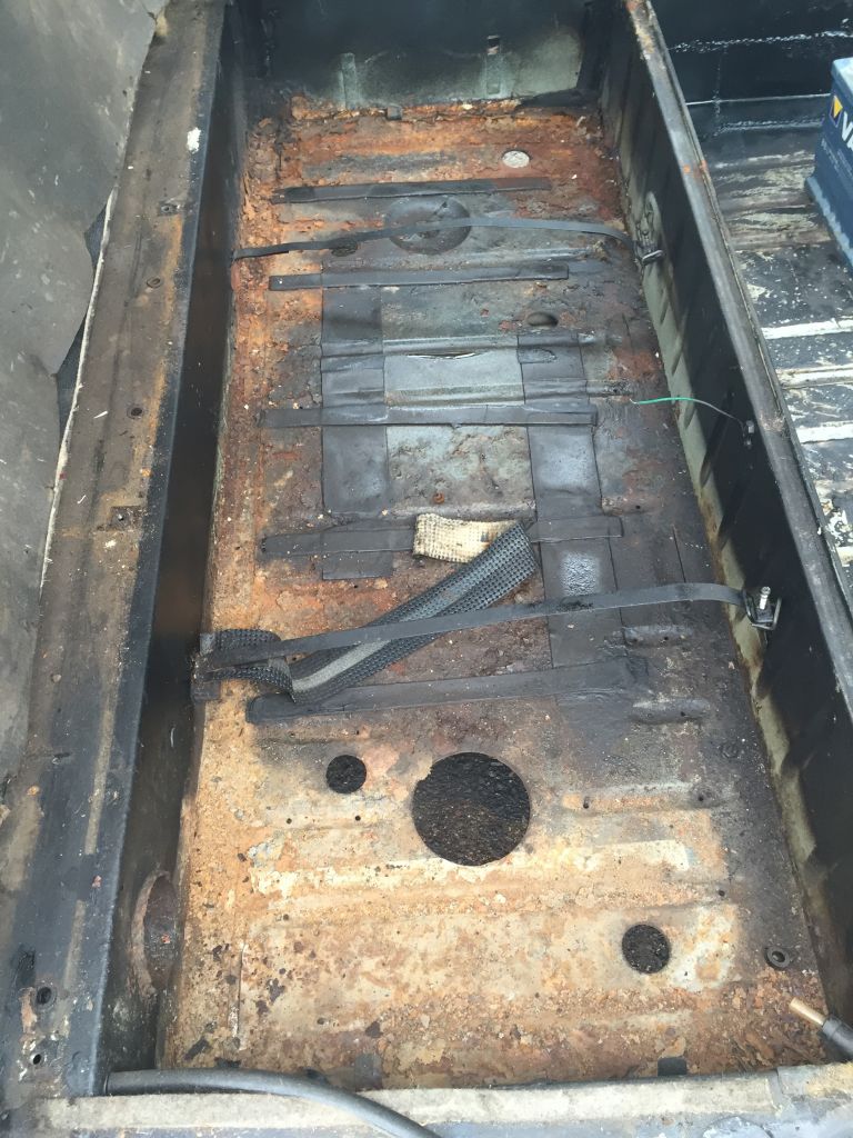 Tankin poisnoston jälkeen nielaisin vahvasti tyhjää koska tila näytti aivan järkyttävältä. Pienen rauhoittelevan kahvitauon jälkeen syvennyin koteloon tarkemmin. Huolellisen skraapailun, imuroinnin ja Xyleeni -pesun jälkeen tilanne kääntyi täysin päälaelleen. Pohja täysin ehjä, apurin takaoven kohdalla kynnyspalkin alareunassa, pystyseinämässä ruostevaurio, josta sipaisin 5cm peltiä vex ja Bilteman pellintaivutuskoneelle oli jälleen käyttöä.