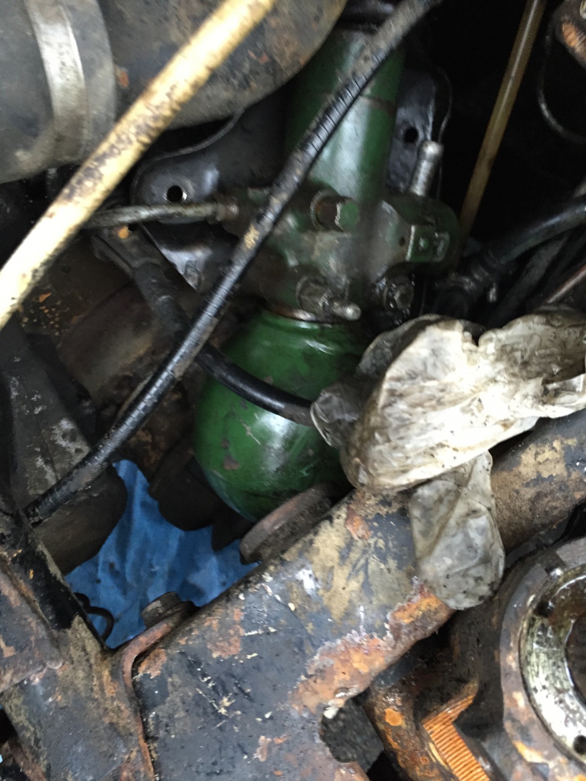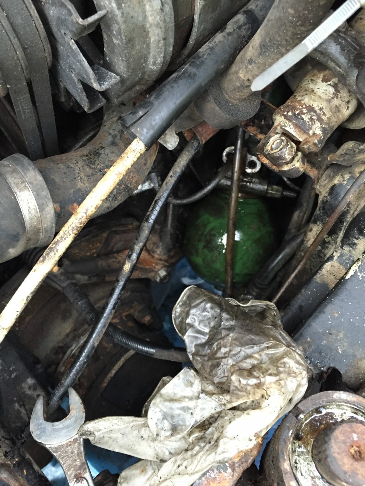 Jonkun pitkän tangon, oliskos ollu vaihdevipu ja pari korkeapaineputkea ja yhen plöröpuolen putken irrotettuani tilaa alkoikin olla varsinaisten kiinnityspulttien irrotteluun ja pian (3h kuluttua) liukas vihreä mollukka oli irti. Oli näköjään mallia halpis eli huoltovapaa eli ongelmajätettä versio.