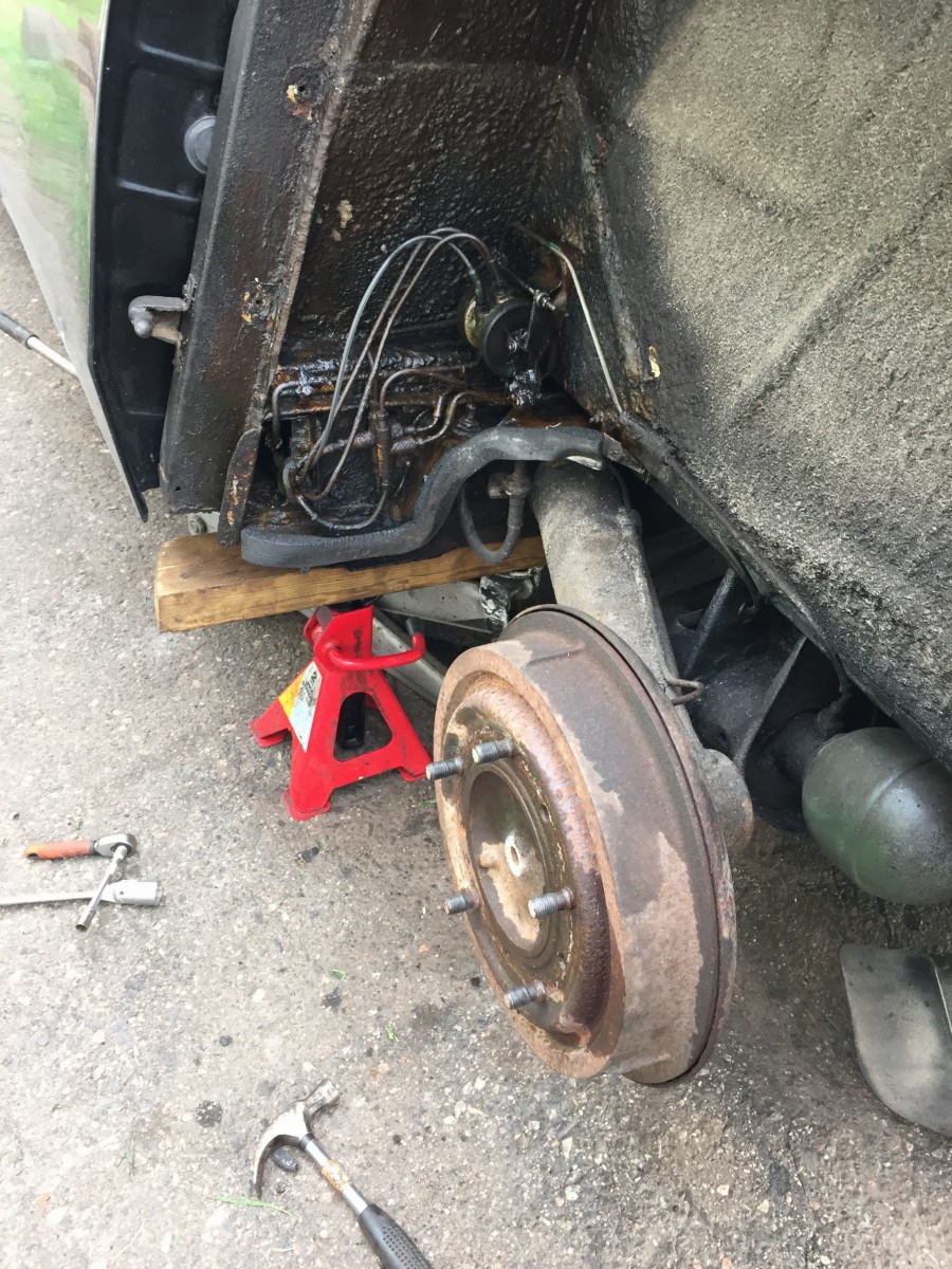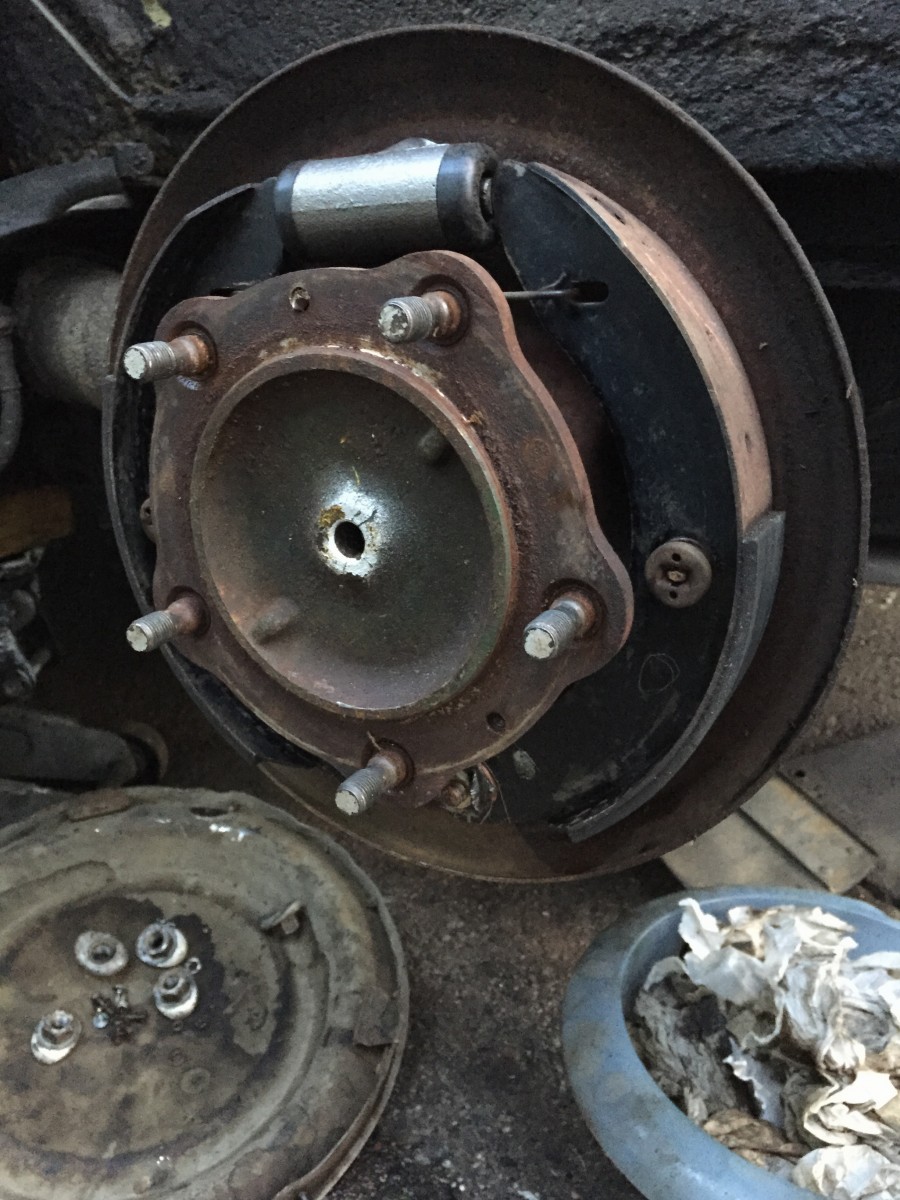 Loksu irti, sisäloksu irti, pyörä irti, hydehämähäkin pesän suojapelti irti, jarrurummun 2 kiinnitysruuvia irti, jarrurumpu irti, jarrukenkien kiinnityssokat irti, jarrukenkien palautusjousi irti, jarrukenkien alapään kiinnitykset irti (epäkeskojen asento merkattava), jarruletku irti tai poikki & vaihto, jarrusylinteri irti, helevetillinen pesu- & kuivausoperaatio ja sama homma toistepäin... Melkein...