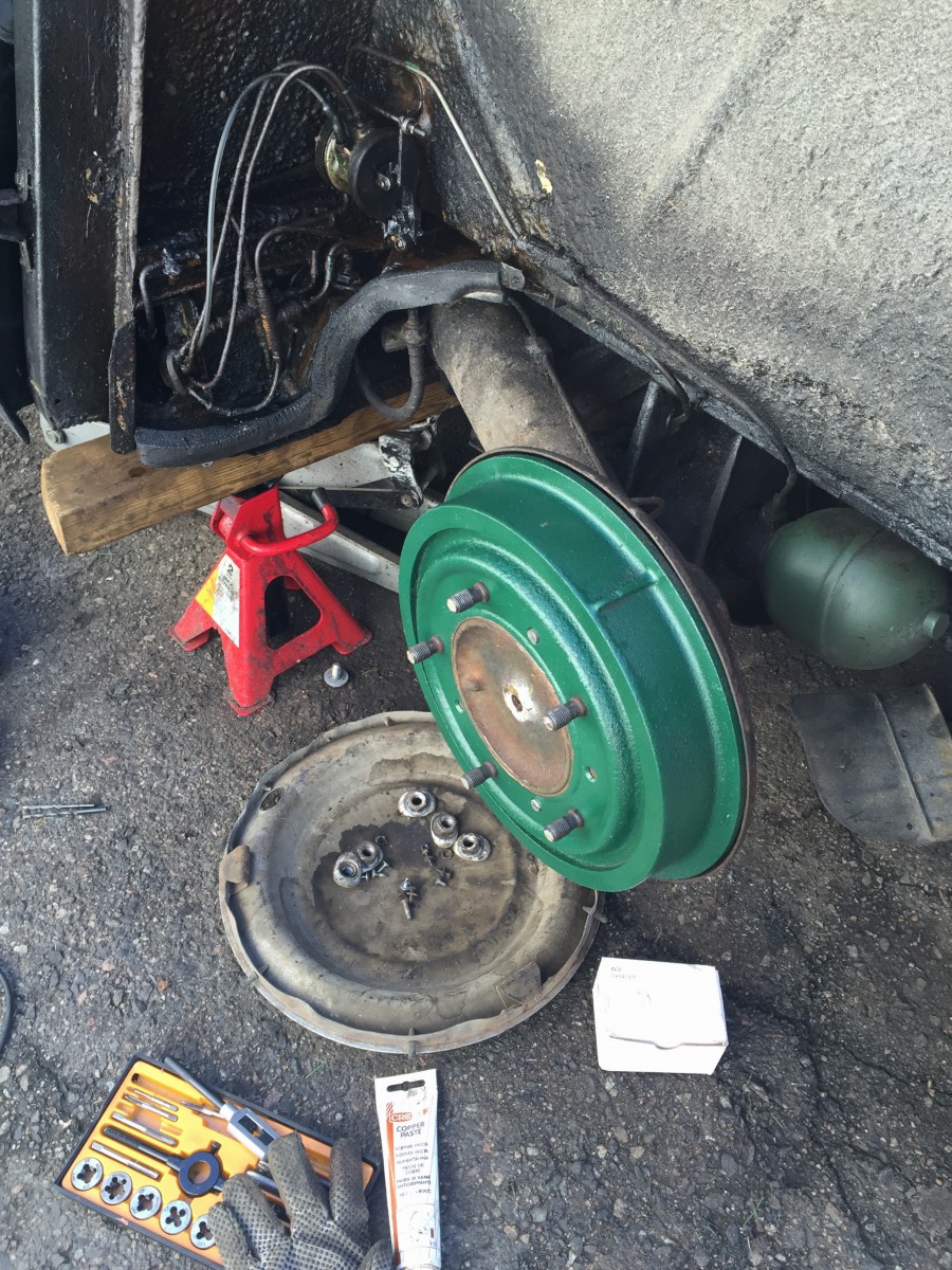Ryskeen ja ropinan välissä oli sen verran rakoa, että kerkesin läjätä jarrut itteeni hirveesti liottamatta. Katkaistun jarrurummun kiinnitysruuvin jämät porasin vex ja pyöräytin uuden kierteen reikeliin. Romujen seasta löytyi jopa sopivat ruuvit joilla rummun sai napakasti kiinni. Tosin ei se kyllä siitä minnekään tietämättä lähe vaikkei ruuveja oliskaan...